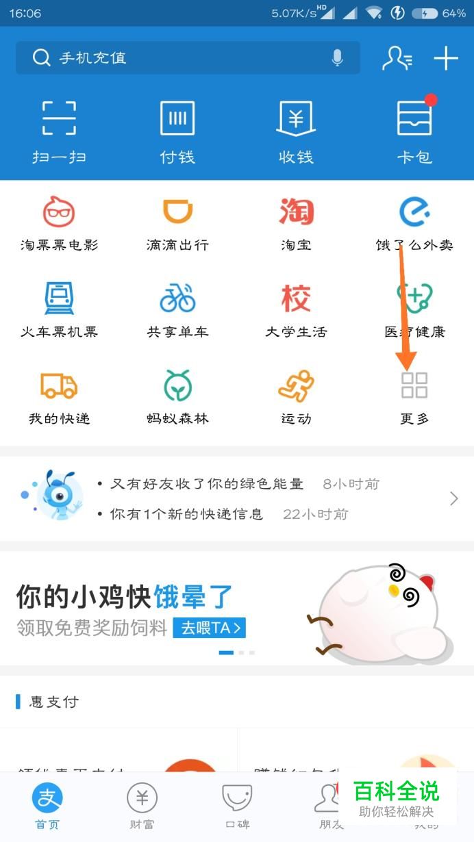 打开支付宝APP,点击主页的更多功能(不是充值)。