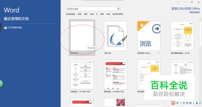 启动Word 2016文字处理应用软件,如图所示点击屏幕右侧新建空白文档。