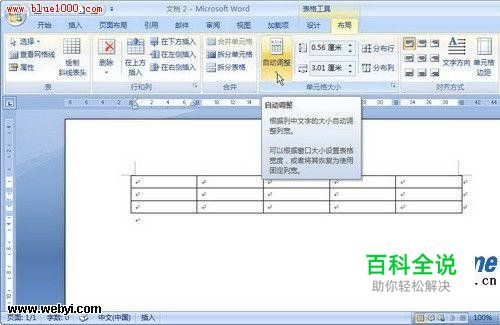 第1步,打开Word2007文档窗口,单击表格中任意单元格。在“表格工具”功能区切换到“布局”选项卡,然后在“单元格大小”分组中单击“自动调整”按钮,如图所示。