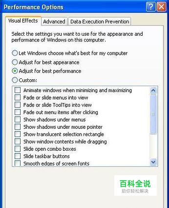 你将看到一个性能选项“窗口。 下面你会看到,你必须向您提供一些预先定义的设置。 你可以让Windows选择什么是最适合您的计算机,或者你可以选择调整为最佳外观或性能最好的设置。 下面这些预定义的设置,你有一个“自定义”选项,允许你选择你想从下面的“自定义”列表的功能。
