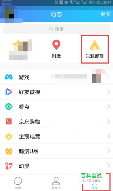 首先,我们打开我们手机上的QQ,然后我们点击动态,之后我们点击兴趣部落;