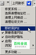 三、保护IE不受破坏 修复IE对于上网助手来说只是小儿科,它对IE的实时保护才是最让人称道的。点击IE工具栏上上网助手图标右边的向下箭头,选择“即时保护IE”,这样您的IE就百毒不侵了(如图2): 总之,3721上网助手不仅可以清除QQ尾巴病毒、修复被QQ尾巴病毒篡改的系统,还能保护IE免受QQ尾巴病毒的袭击,笔者认为它是Q友们必备的上网工具。