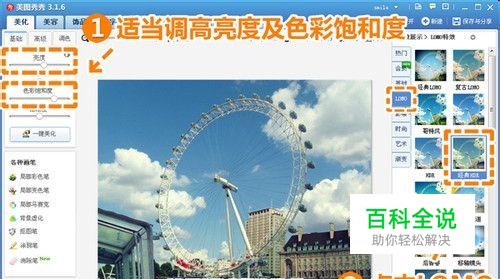 在“美图秀秀”中打开一张街景照片,进入“美化”菜单下适当调高亮度及色彩饱和度,再点击“LOMO”特效分类,使用透明度为40%的“经典HDR”特效。