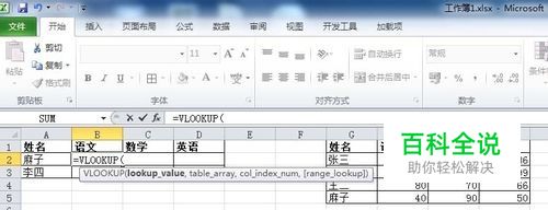 2、在表a的B2单元格使用VLOOKUP公式: 输入“=vlookup(”后出现提示,如下。 (其中第一个输入的是需要查找的值,第二个是被查找的数据表,第三个是我们要找到的结果,第四个写成0即可-精确匹配。 第一个值:A2 (麻子) 第二个值:G:J (注意要将G到J四列全部选择,不可以选成G1:J5的固定区域,否则会匹配出错。另外在被查找的表中,一定要将包含查找值得列放到选择区域的第一列) 第三个值:2 ,即找到值后,返回数据表中第2列的数值,即40。 第四个值:0 ,进行精确匹配。
