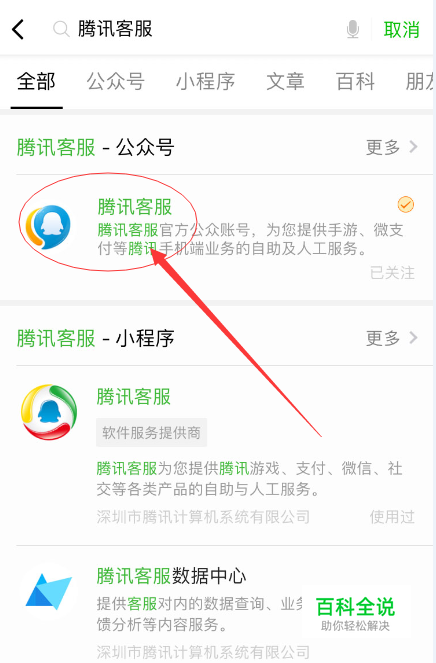 打开微信,搜索【腾讯客服】,选择如图所示的第一个【腾讯客服】公众号/小程序,这里以公众号为例;