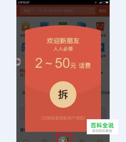 打开58同城app,选择所在城市,例如我们选择北京。将领话费的页面关闭。