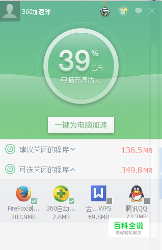 关闭后台软件 如果有大量的后台软件正在运行,势必导致运行内存不足,CPU资源大幅占用,这时候应该关闭应用及相关服务,清理内存,给电脑带来良好的运行环境。 可以使用常用的360加速球来关闭一些不必要的服务和程序以及无响应的程序