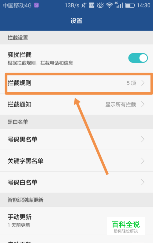 进入骚扰拦截的【设置】界面,在【拦截设置】栏下,找到【拦截规则】并点击,如图:
