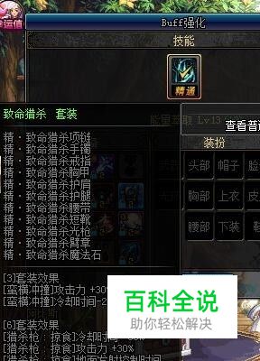buff技能能量萃取必满,如果有条件的话尽量简单的打造一下buff装,致命猎杀6件套即可,增加10%的技能攻击力,武器的话选择传承就挺好的。