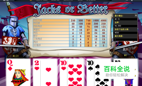 第二,單擊賭一個或者賭最大按鈕選擇您想下注的硬幣數。單擊一次賭一個按鈕可在賭注中增加一個硬幣。單擊賭最大,您的賭注將會增加至最大(即五個硬幣),並且自動發牌。您也可以單擊贏率表上的相應列來指定您的賭注大小。