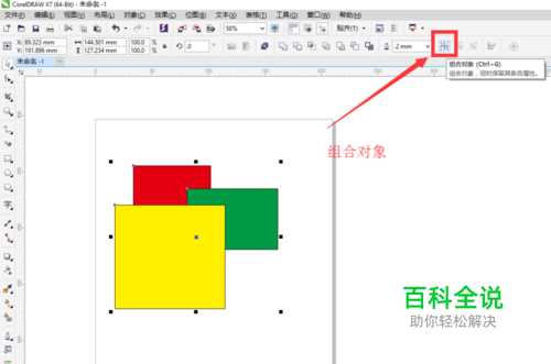 我们在选择工具的属性栏中可以看到组合对象。在cdr中群组命令被叫做组合对象,它的快捷键是Ctrl+G,如下图所示。