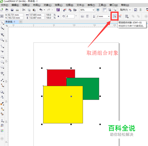 取消编组也是在选择工具属性栏中的取消组合对象,快捷键是Ctrl+U,如下图所示。