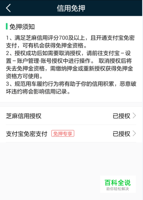 可以看到免押金的一些说明,先点击“芝麻信用授权”,并根据提示进行授权的确认。(如下图一,图二)