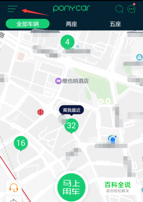 在手机上打开ponycar客户端,完成注册和身份通过验证之后来到首页,点击左上角的三横图标。(如下图)