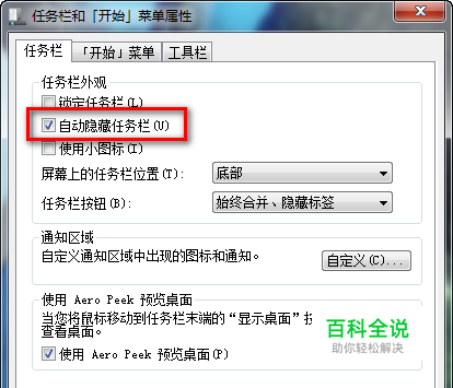 弹出如下框图,选中【自动隐藏任务栏】,然后点击【确定】完成设置。