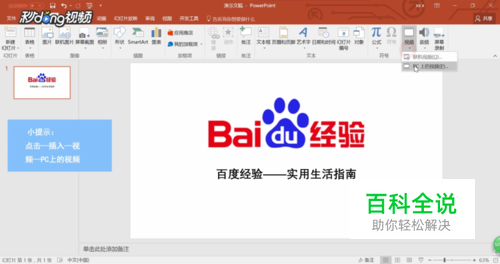 打开PPT,点击上方菜单栏中的“插入”再点击“视频”选择“PC上的视频”
