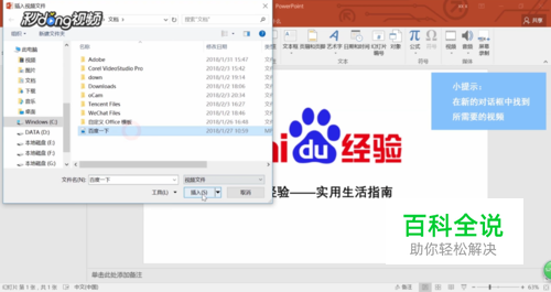 在弹出窗口中找到想要插入的视频,点击插入即可