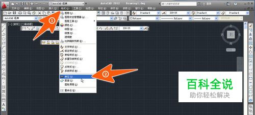 要设置CAD单位的时候,在打开的CAD上面,点击下图中箭头1所指的那个菜单项,再在弹出菜单中点箭头2所指处。