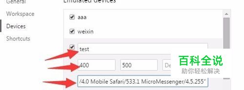 出现添加信息的页面 这里如图添加上边可以随意填写 比如名称 大小分辨率 最重要的是在 User Agent String 框里面填写一下信息 “Mozilla/5.0 (Linux; U; Android 2.3.6; zh-cn; GT-S5660 Build/GINGERBREAD) AppleWebKit/533.1 (KHTML, like Gecko) Version/4.0 Mobile Safari/533.1 MicroMessenger/4.5.255” 最后点击 add device 按钮 添加最后现在device的选择框中