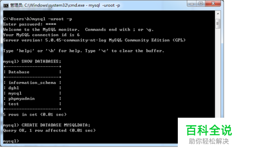 1:使用SHOW语句找出在服务器上当前存在什么数据库: mysql> SHOW DATABASES; 2:2、创建一个数据库MYSQLDATA mysql> CREATE DATABASE MYSQLDATA; 3:选择你所创建的数据库 mysql> USE MYSQLDATA; (按回车键出现Database changed 时说明操作成功!) 4:查看现在的数据库中存在什么表 mysql> SHOW TABLES; 5:创建一个数据库表 mysql> CREATE TABLE MYTABLE (name VARCHAR(20), sex CHAR(1)); 6:显示表的结构: mysql> DESCRIBE MYTABLE;