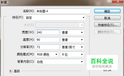 新建一个图层,根据自己的logo设计大小,进行设置。这里我的设置为宽”240“像素,高”90“像素。