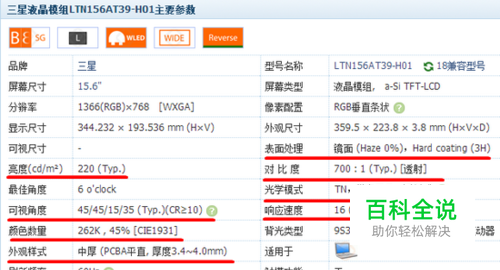 这时,直接点击型号名便可以看到具体的参数详情了。 下面来说一下个别难懂的参数究竟代表什么含义: 【光学模式】在这里可以查看到是否为IPS屏,比如我这里就不是,我这里是TN屏。一般说来,IPS屏更好。 【表面处理】可以查看是“镜面”还是“雾面”,镜面色彩更艳丽,但容易有反光,一般说来雾面更适合日常使用,也更护眼。