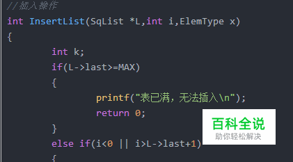 插入操作,这一步是关键,插入顺序表 int InsertList(SqList *L,int i,ElemType x) { int k; if(L->last>=MAX) { printf("表已满,无法插入\n"); return 0; } else if(i<0 || i>L->last+1) { printf("插入位置不合法\n"); return 0; }