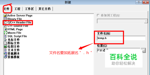 在新建功能中选择文件,再选择c/c++ header file,然后再在右边文件名输入你想用的头文件名字**.h(最好用英文的名字,而且文件的拓展名.h要带上),输完名字点击确认,如图!