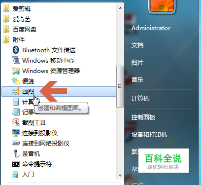 点击windows7开始按钮,找到“所有程序”的“附件”中的“画图”,点击打开。