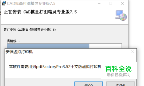 到 yiyunsoftware.com 下载 CAD批量打图精灵 到电脑,运行“Setup.exe”,按步骤安装。 需注意以下几点: 1). 对Win7、Win10等操作系统可能需要以管理员身份运行安装程序。 2). 若您之前没有安装“pdfFactory”虚拟打印机,则安装过程中会提示是否需要安装该打印机,这里我们选择“是”。