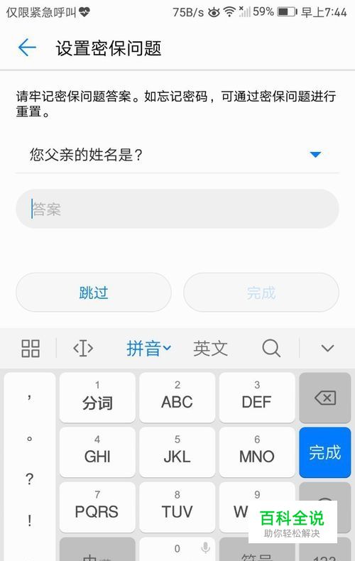 然后写上问题的答案,当然你也可以自定义问题,问题输入完成,单击“完成”即可,如果不想设置密保问题的话也可以直接单击“跳过”