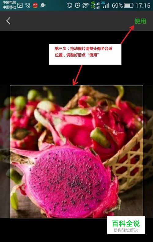 第三步:选定后会跳出这个界面,在这个界面里面拖动图片,调整图片位置,直到框取的头像理想。再点击右上角的“使用”,就完成了头像的设置。