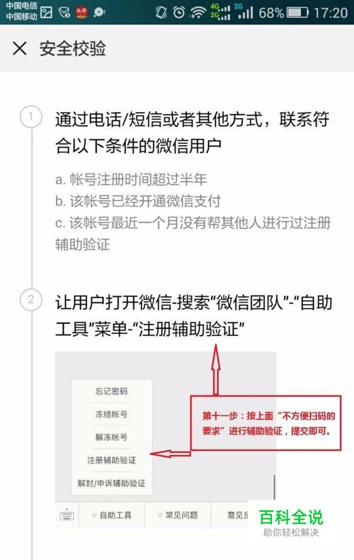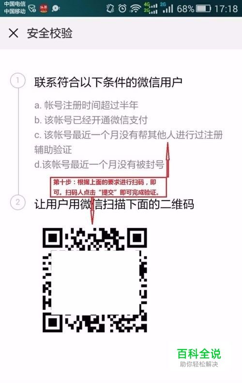 第十步:这时根据界面的要求找一个符合要求的微信号进行扫描二维码,即可。扫码人扫码后,会出现一个界面,输入号码,点击“提交”即可完成验证。如果不方便扫码就点这里,进行下一步辅助验证。 安全验证通不过怎么办: 如果扫码提交后提示:微信号资质不符合要求等等而无法完成验证的,其实不是微信号的问题,而是手机号码的问题。您如果是移动的号码,就要用移动的号码扫描,如果是电信的号码就要用电信的号码扫描,反正要用同一通信系统的号码才行。