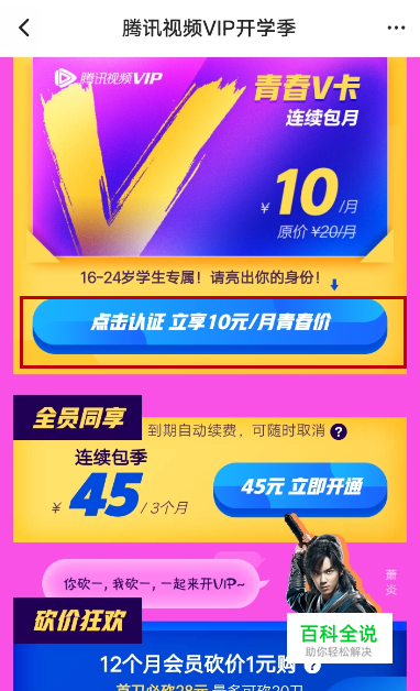 九月对于很多学生来说都是一个新的开始,在这个月,腾讯视频为了能够給学生提供更好的福利就推出了一个学生专享VIP开学季青春v卡的活动,如果你是学生你可以用10块钱开通一个月的会员,还可以拉好友一起砍价还能够以最低的价格开通12个月的会员哟!详细的开通方法如下所示。