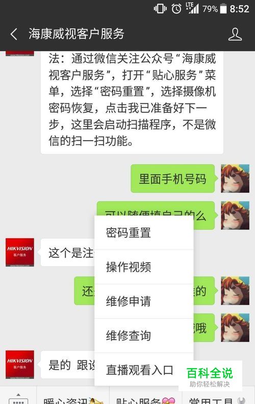 微信上关注海康威视客户服务,点击贴心服务,选择密码重置功能
