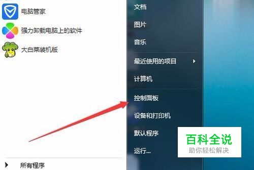 在Windows7系统桌面,点击左下角的开始按钮,然后在弹出菜单中选择“控制面板”菜单项