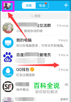 一、QQ怎么绑定手机? 手机登录QQ,进入QQ主面板消息界面,用手向右滑动手机屏幕或者点击界面左上角的QQ头像。