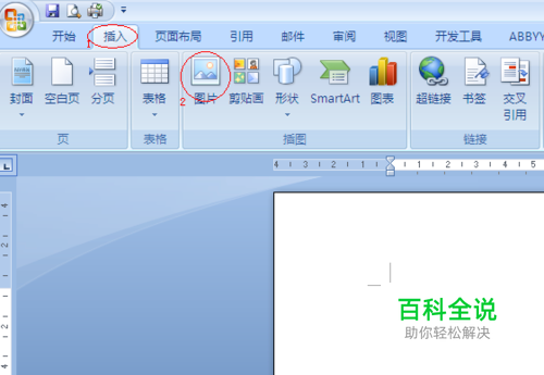 本方法以Word2007为例说明。首先打开Word2007程序,新建空白文档,单击“插入”按钮,点击“图片”项(如图1)。