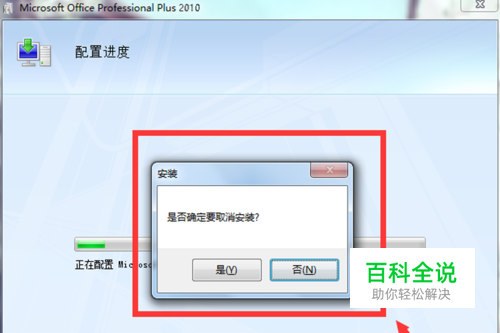 2.1首先,待打开office2010软件的时候,等待软件提示正在配置对话框出现,点击“是”取消配置,如图
