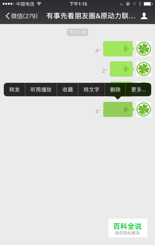 第二步,测试转发语音,让朋友发一条语音给你,你长按这条语音2秒应该就会出现转发选项了