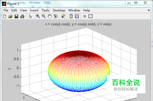 球面 打开Matlab输入下面代码点击Enter。下面操作一样。 >> ezmesh('cos(u)*cos(v)','cos(u)*sin(v)','sin(u)')