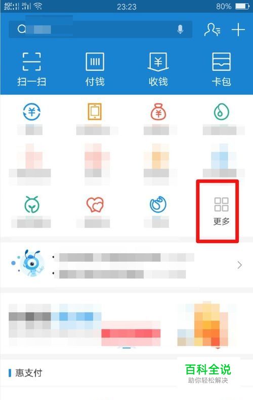 支付宝在登录的状态下,在首页点击「更多」选项。如图所示