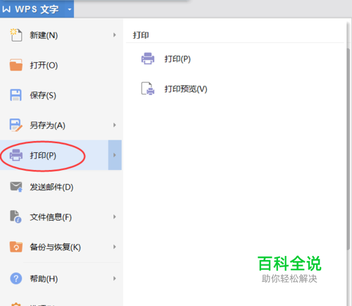 在点击【WPS文字】按钮后弹出的菜单下,点击选择【打印】选项。(如图所示)