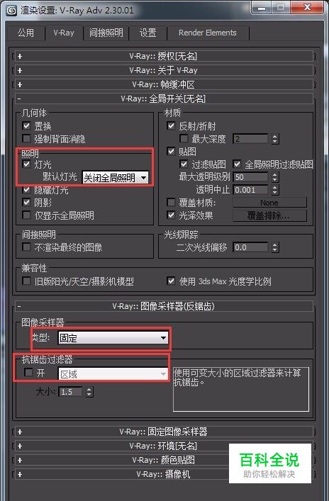 然后,vray——全局开关——关闭全局照明 ,图像采样器——类型——固定——关闭抗锯齿过滤,如下图