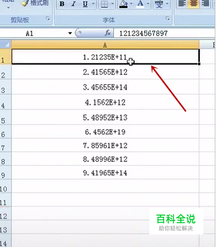 选中单个数据(单元格),位置A1,在单元格函数的后边我们可以看到显示的还是正常的数字,但是在单元格内的显示却是数字E+数字。