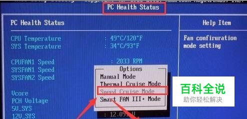 1、进入bios中,找到pc health status,进入计算机健康状况调理页面,然后找到“cpufan1 mode setting”并将光标移动到该处,按回车,在弹出的小窗口中移动“↑↓”键选中“speed cruise mode”(按转速调理)并按回车,如图: