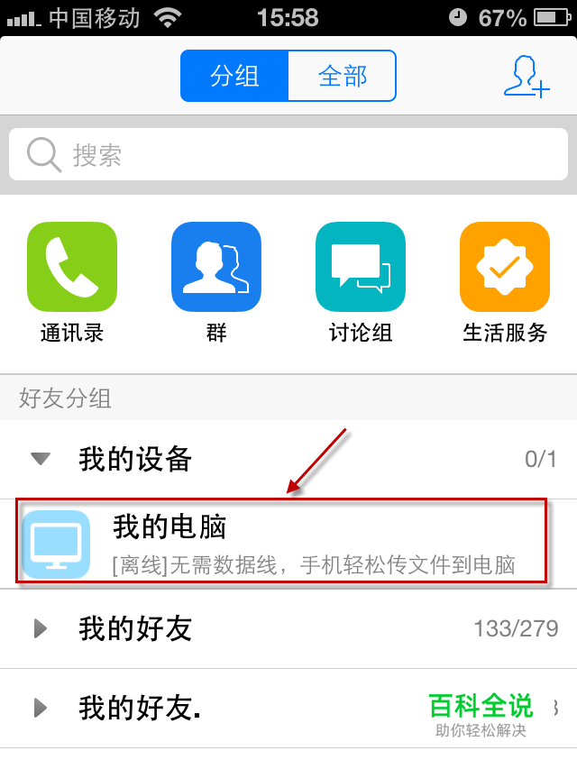 1.打开手机端QQ,找到“我的设备”------>"我的电脑"