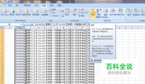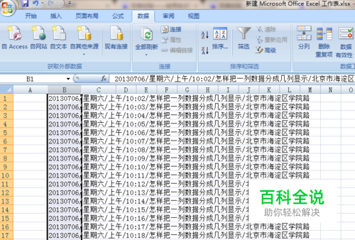 可以对最后一列的“北京市海淀区学院路”继续细分为3列,分列过程与前面类似,先选中这一列,在“数据”菜单窗口中点击“分列”按钮。