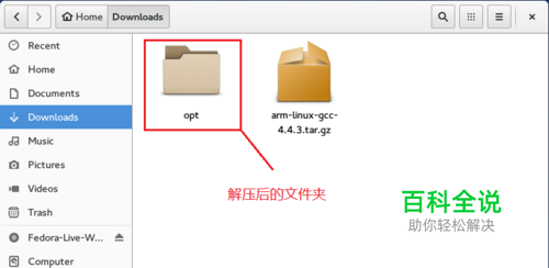 进入Linux的终端,将当前目录设为arm-linux-gcc的下载目录,输入tar -xzf arm-linux-gcc-4.4.3.tar.gz,将文件解压,解压后会有一个opt的文件夹。
