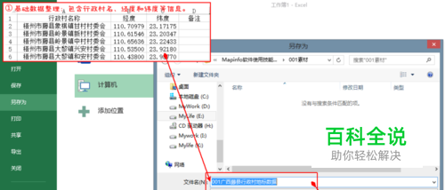 步骤一 基础地标信息数据准备及修改 准备包含行政村名称、经度及纬度等行政村地标数据,注意,经纬度的数据格式为浮点格式。处理完成后,由于低版本的Mapinfo不能处理Excel“*.xlsx格式”文件,故建议将数据另存为“Excel 97-2003工作簿”格式,至此基础数据处理结束。